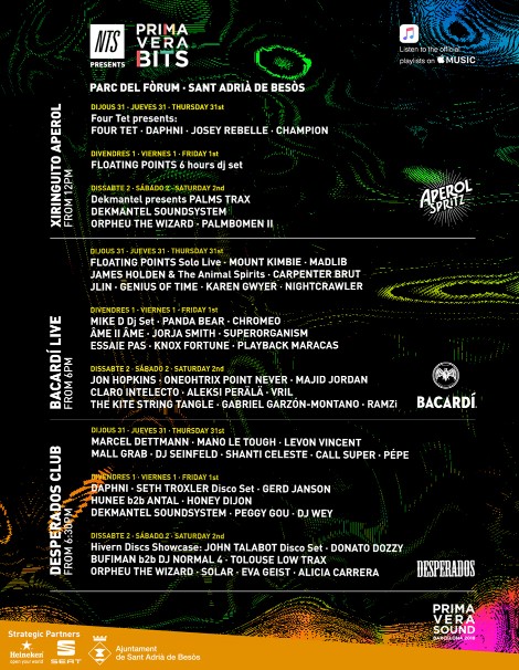 Como siempre, la música electrónica no estará relegada únicamente a Primavera Bits sino que llegará a todos los rincones y escenarios de Primavera Sound. De este modo se podrá vivir la experimentación ensoñadora de Nils Frahm, el hipnótico directo de Four Tet presentando su nuevo disco, los sets de leyendas actuales como The Black Madonna y DJ Koze, las invitaciones al baile de Lindstrøm, Ross From Friends y DJ Python y los directos de THE BLAZE y Delorean esparcidos por todo el Parc del Fòrum: cada asistente podrá ir en búsqueda de su propia aventura. ¡La cuenta atrás ya ha empezado!