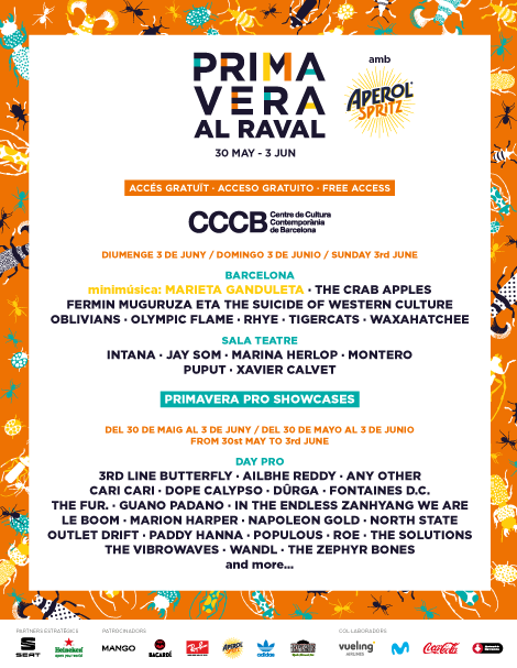 Finalmente, tras las tres jornadas principales en el Parc del Fòrum, el festival volverá a concentrarse en el centro de la ciudad para celebrar la jornada de clausura el domingo 3 de junio. Será en el CCCB con 13 actuaciones completamente gratuitas distribuidas en dos escenarios, entre las que destacarán la explosiva combinación de Fermin Muguruza con The Suicide of Western Culture, nuevos conciertos de RhyeObliviansWaxahatchee y Montero después de haber actuado en el Parc del Fòrum, y representantes de la vibrante escena local como The Crab ApplesXavier Calvet e Intana. En sesión matinal, además, la propuesta de minimúsica deleitará a toda la familia con la actuación de Marieta Ganduleta, un homenaje al mundo de los cuentos y a la cultura popular valenciana.